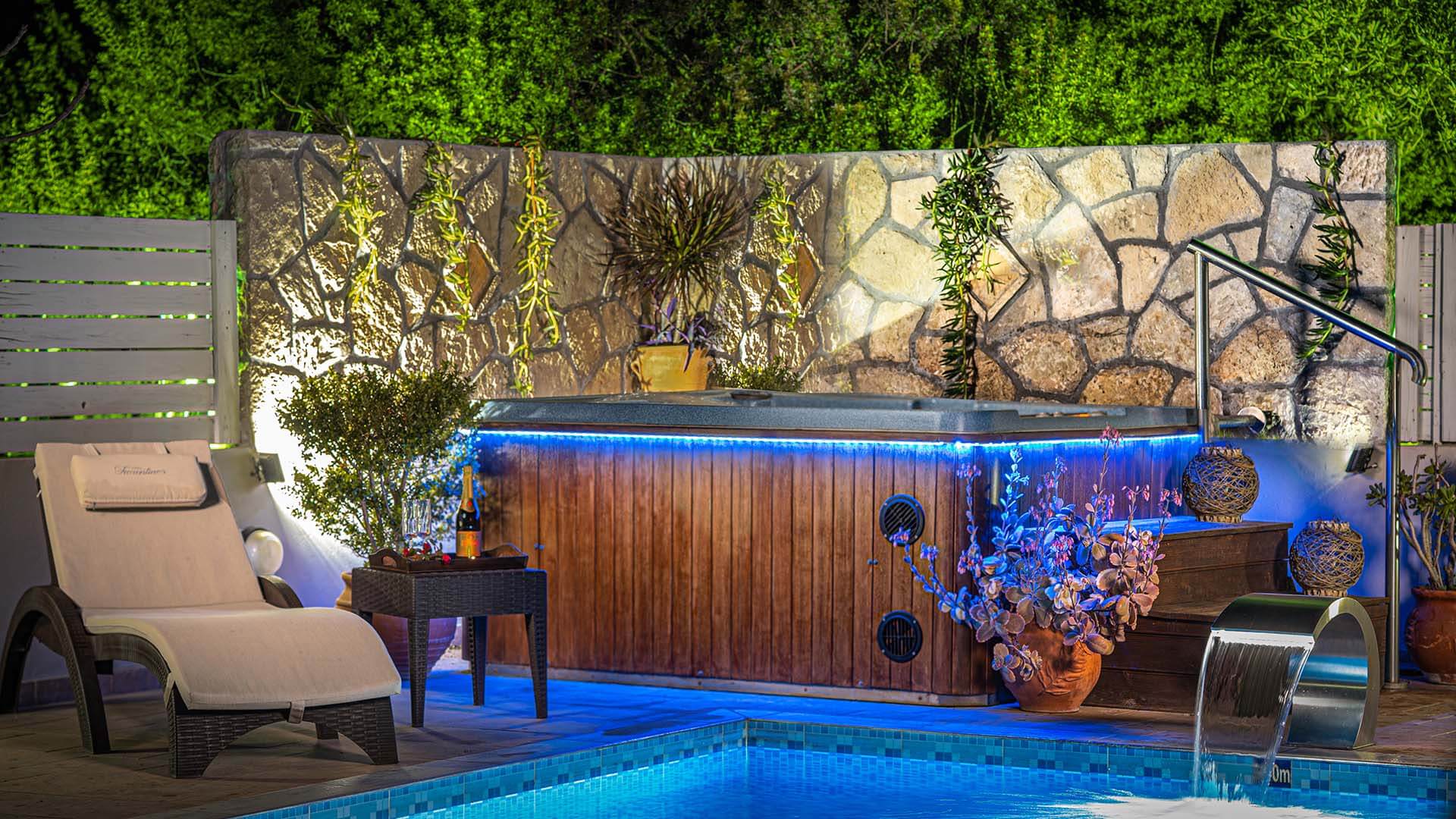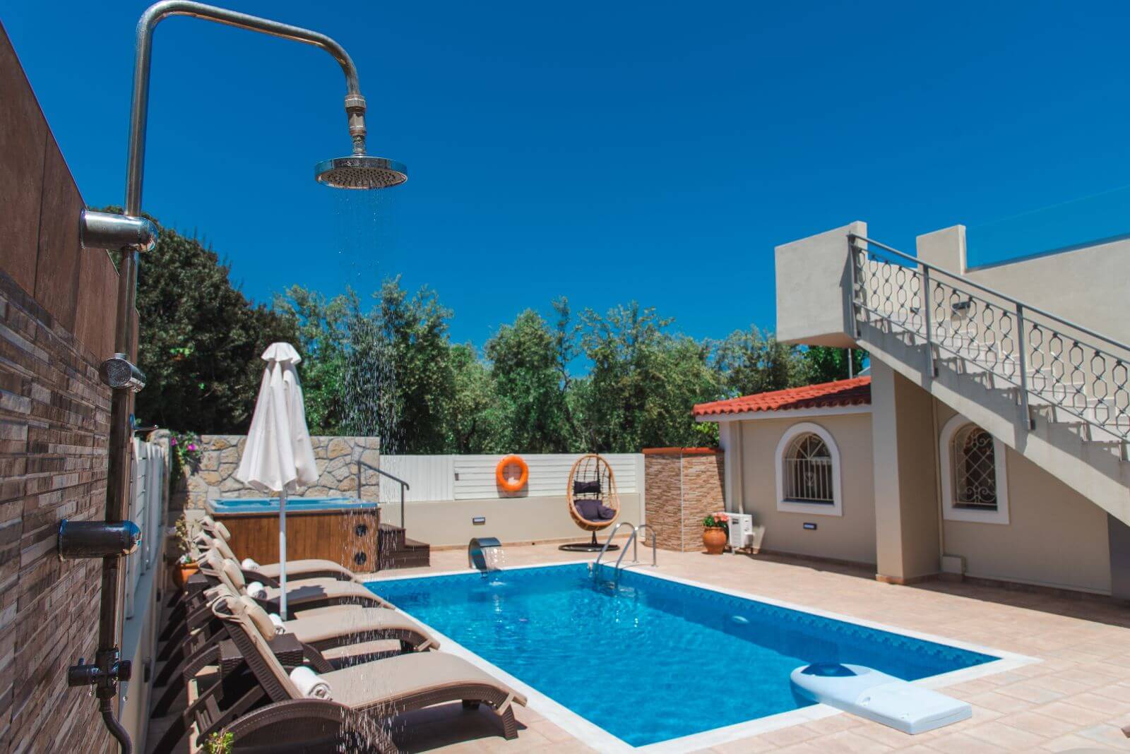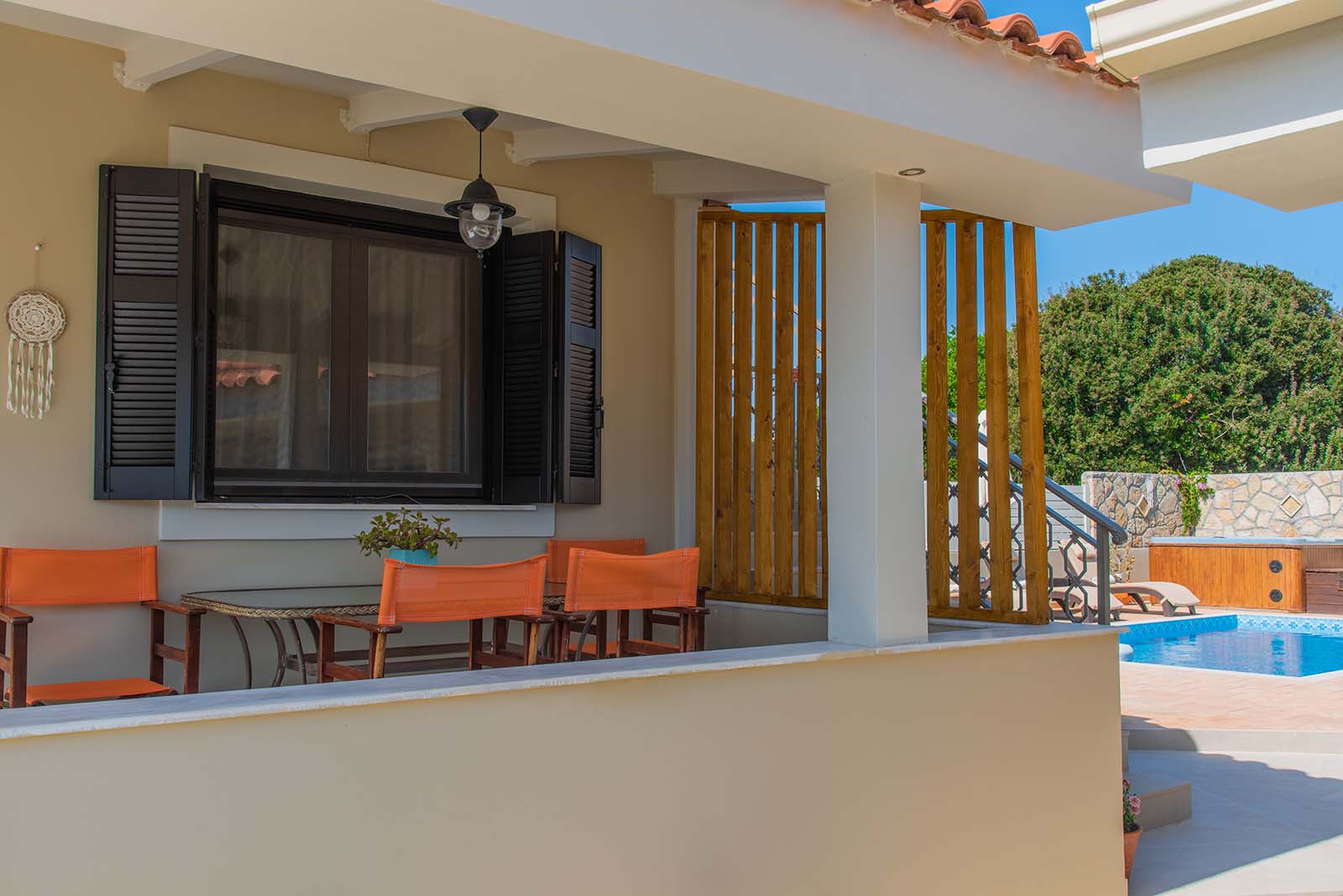 The guesthouse is right next to the main villa. It is a spacious open plan structure recently renovated that features a double and a single bed, kitchen with refrigerator, WC with shower, hairdryer, TV and air conditioning. Here you can find a second furnished shaded veranda with the couple of steps that lead you to the private pool.