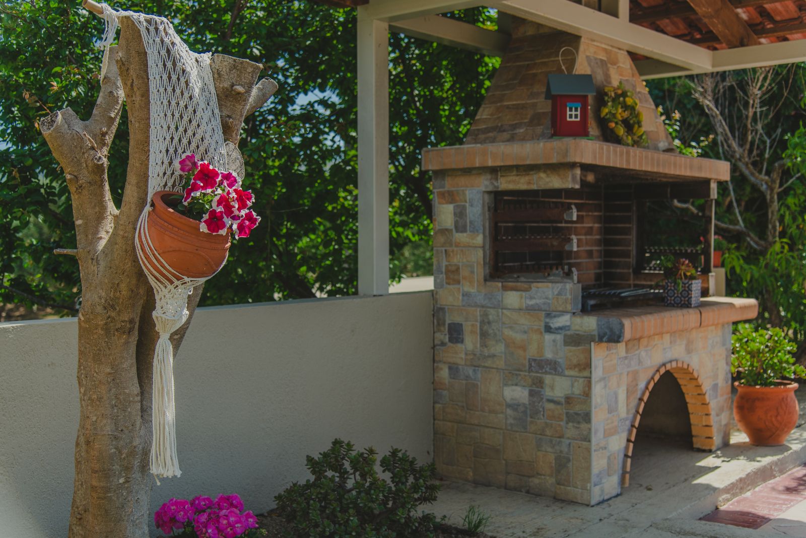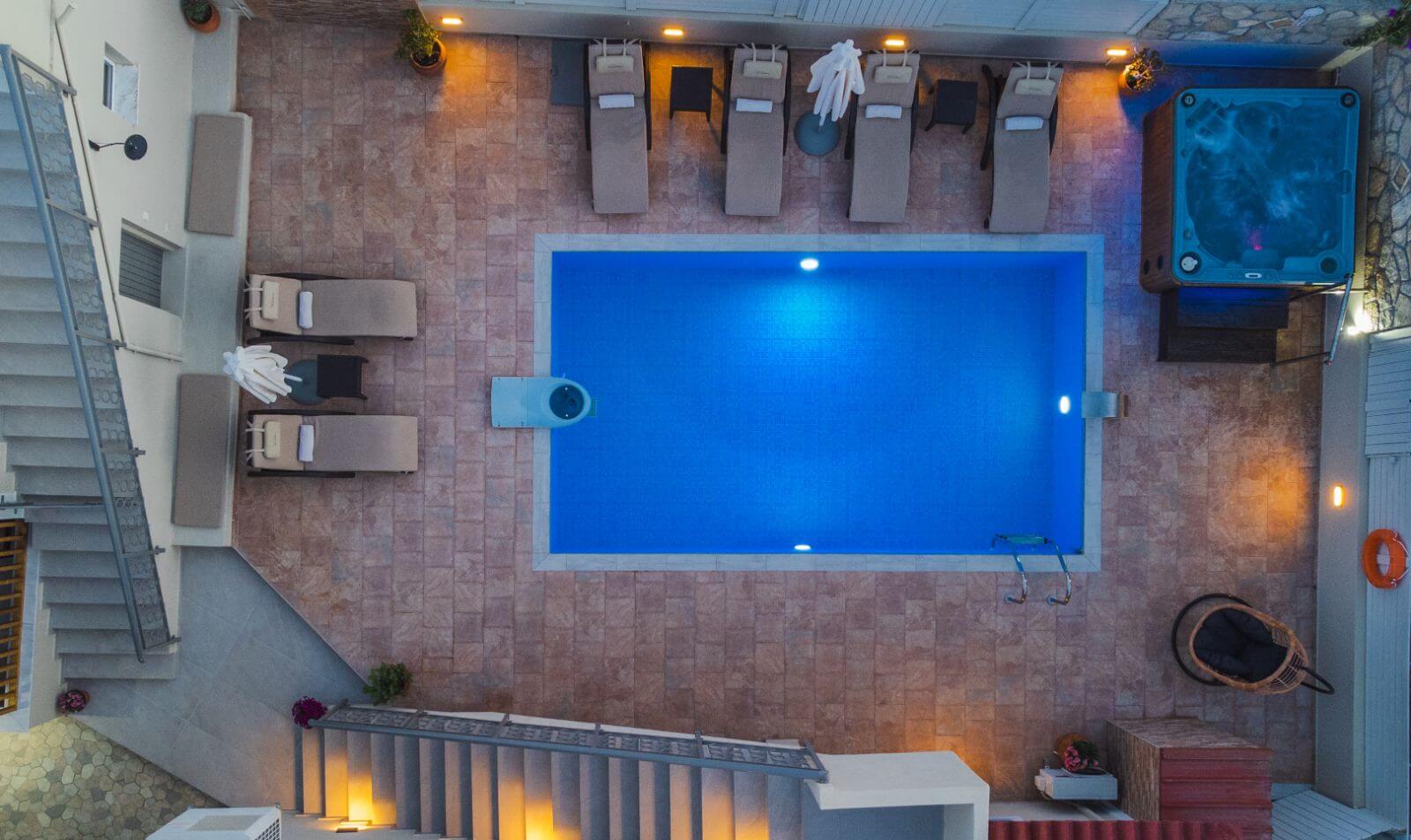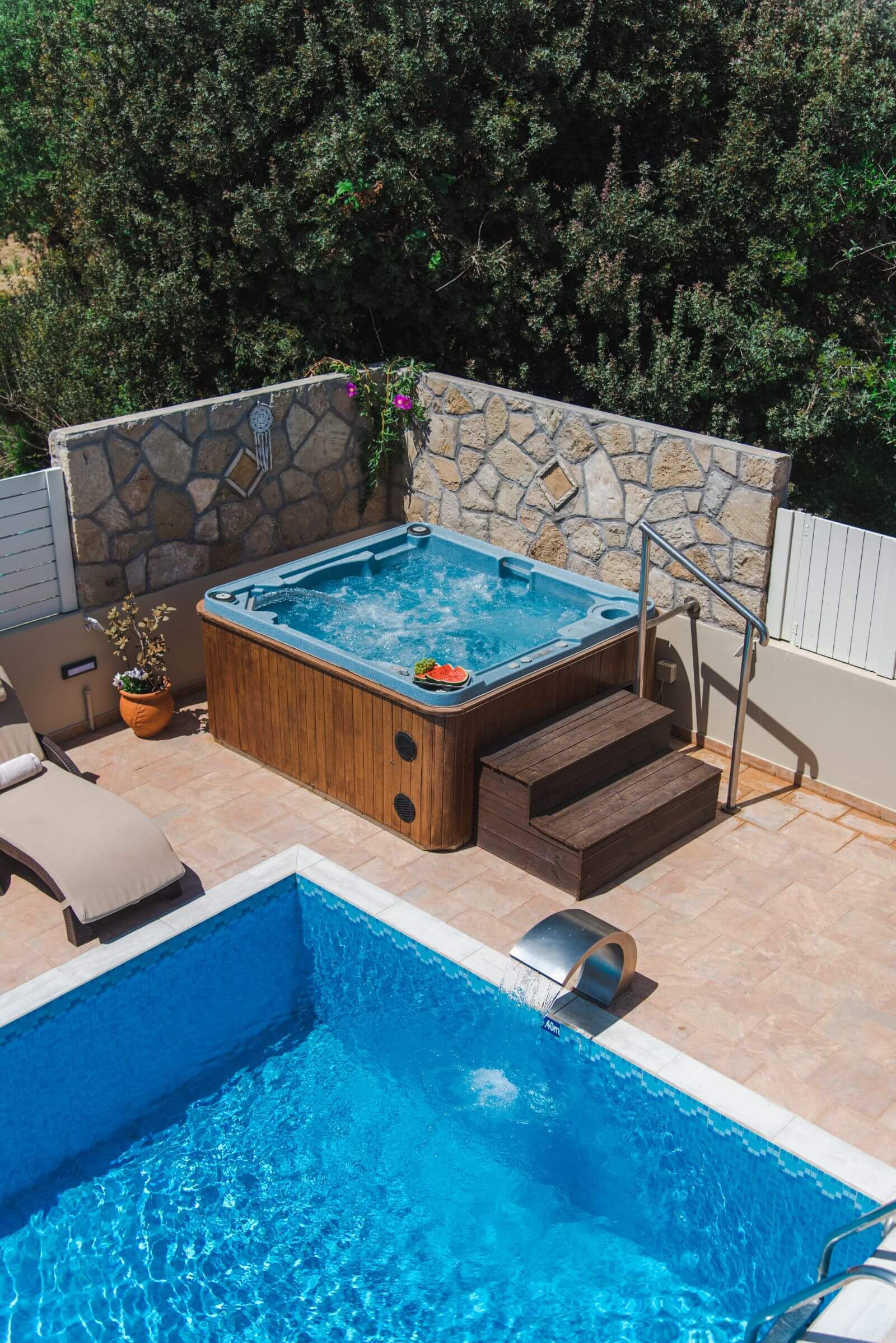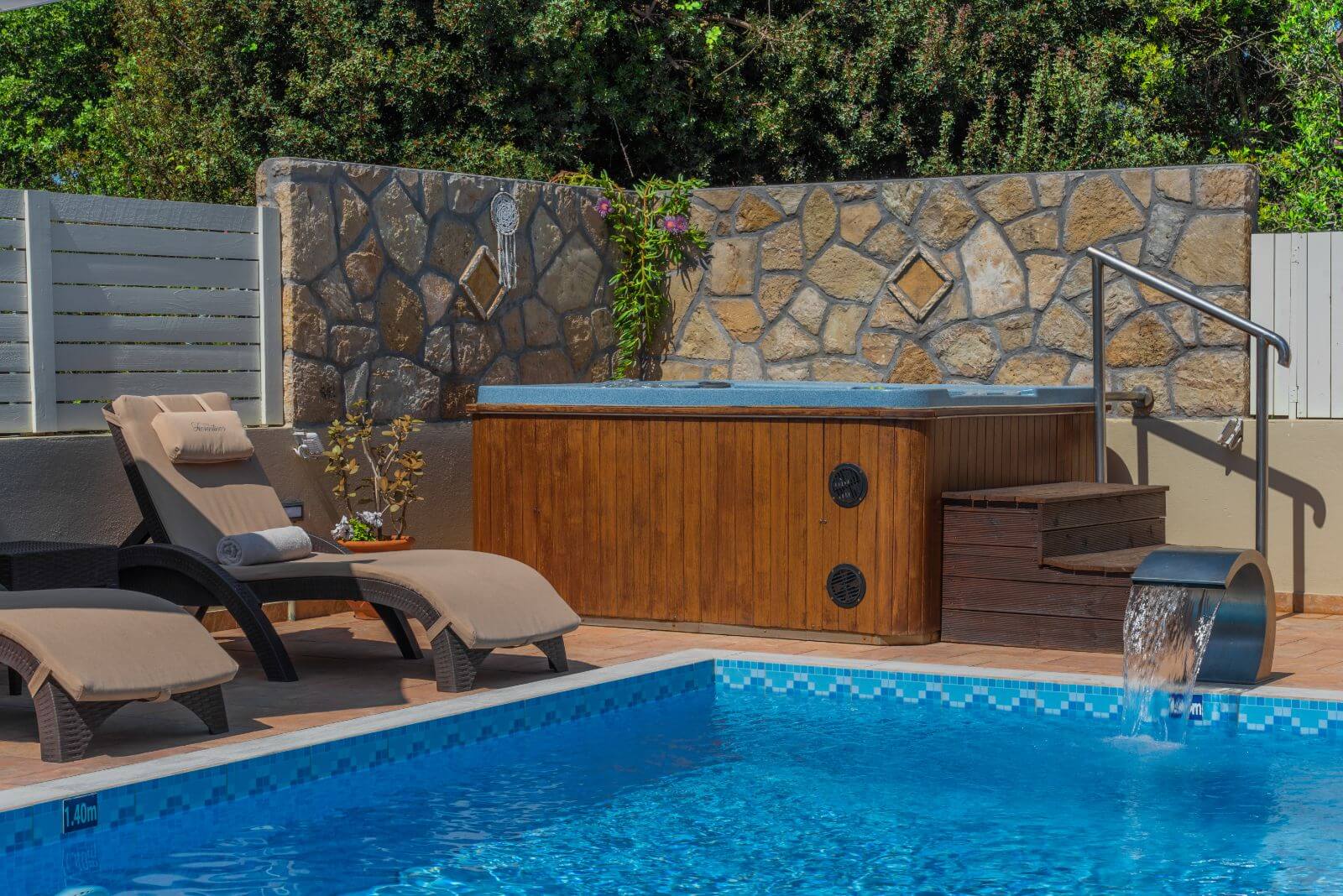 The guesthouse is right next to the main villa. It is a spacious open plan structure recently renovated that features a double and a single bed, kitchen with refrigerator, WC with shower, hairdryer, TV and air conditioning. Here you can find a second furnished shaded veranda with the couple of steps that lead you to the private pool.