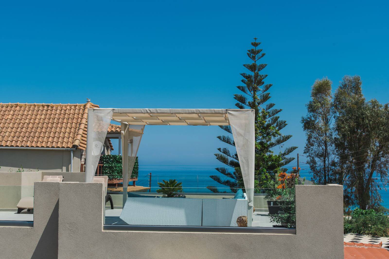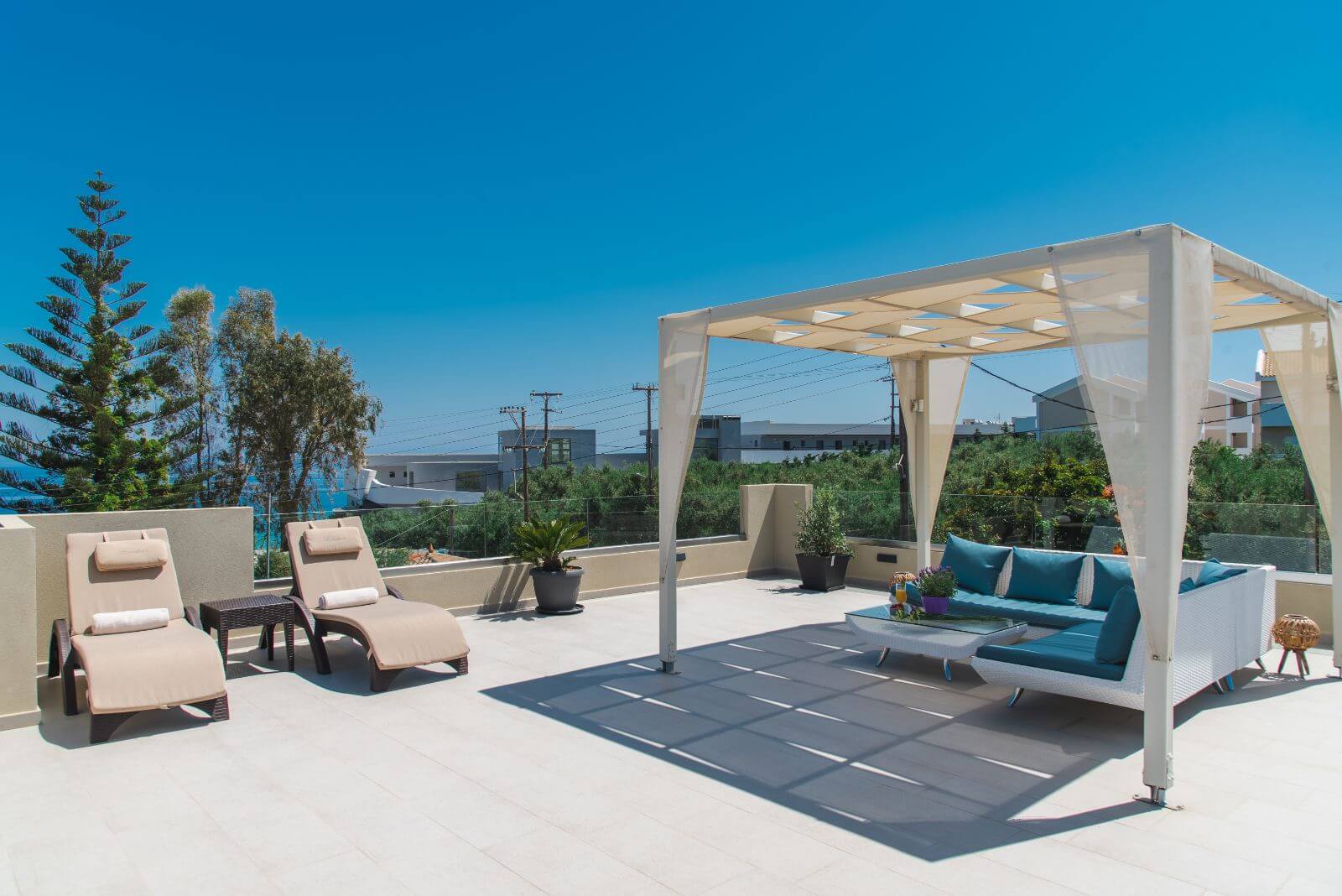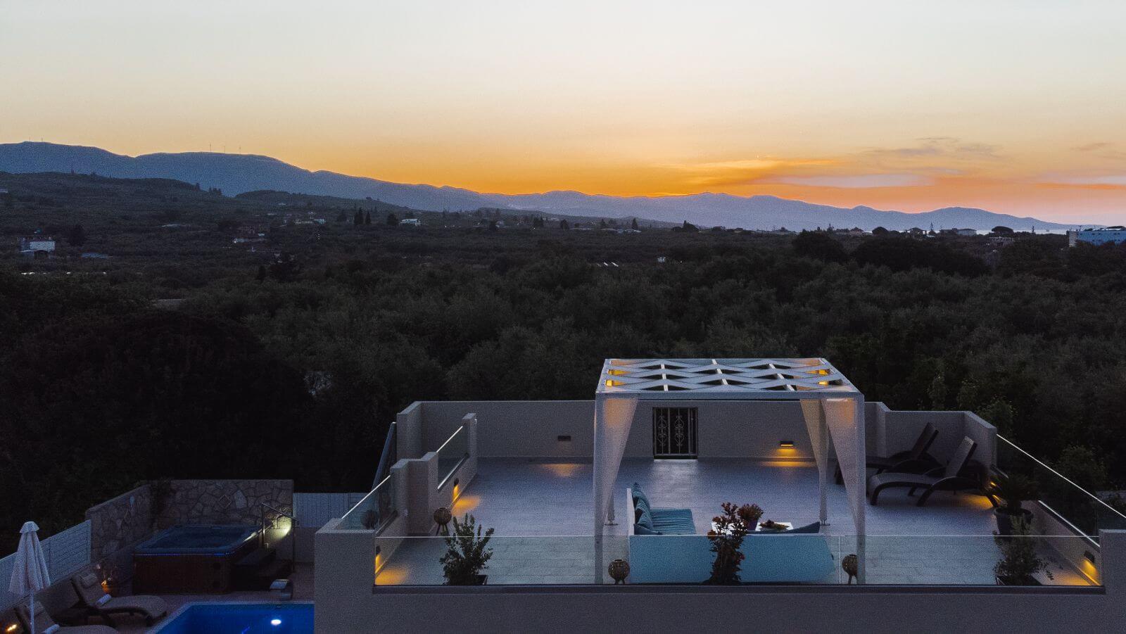 The main villa also offers an especially modified roof where sunbeds are situated as well as a table with chairs under a shaded tent and it is the best place for an evening drink or dinner.