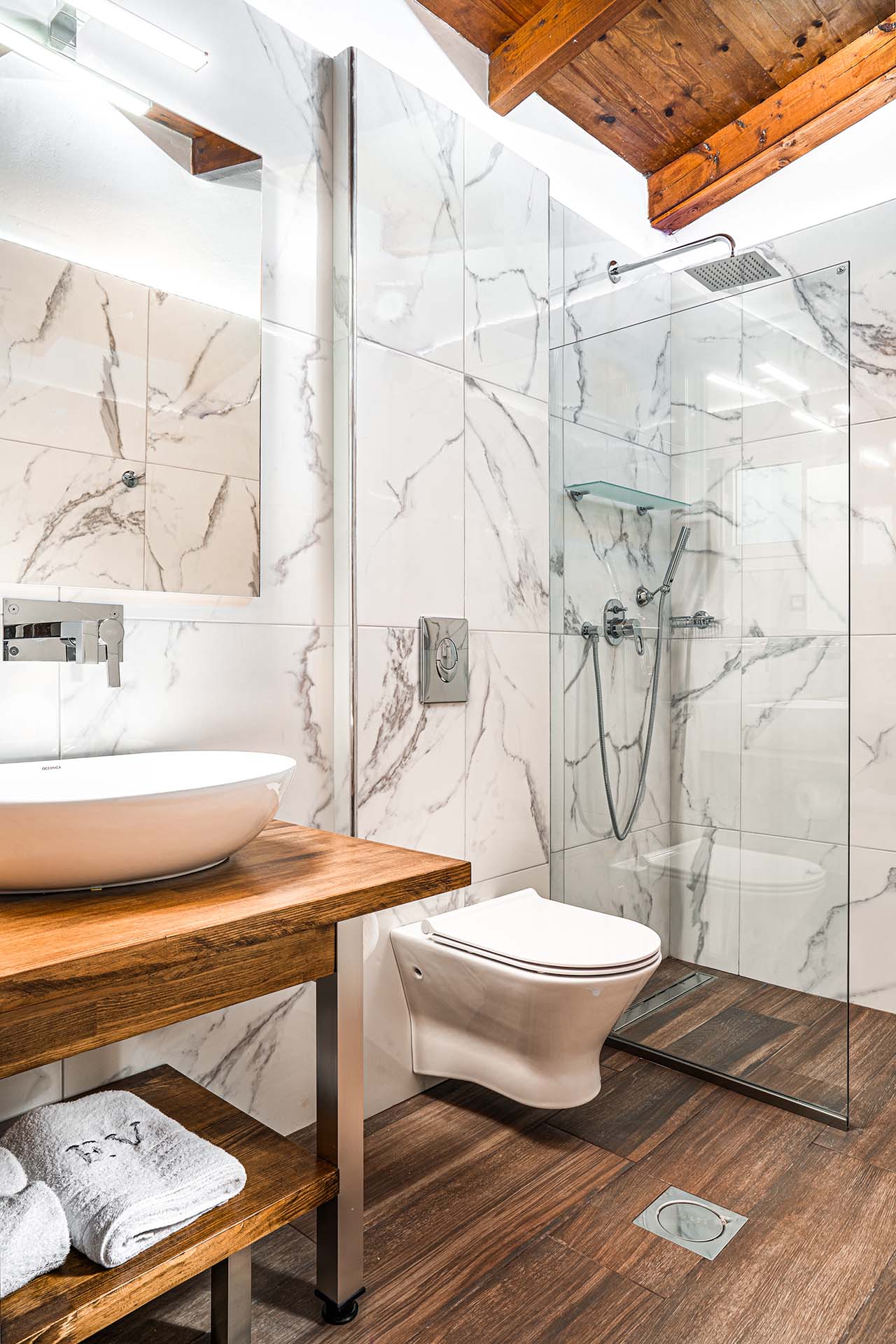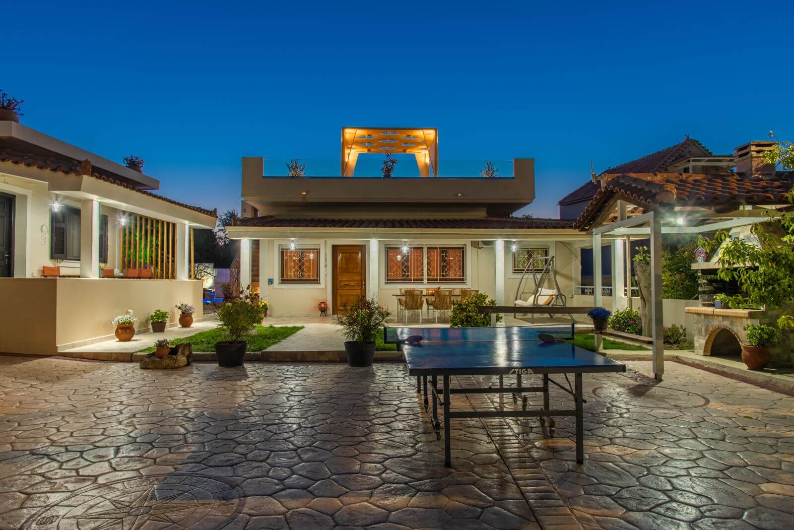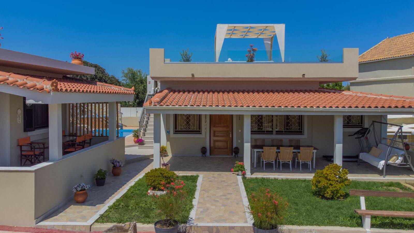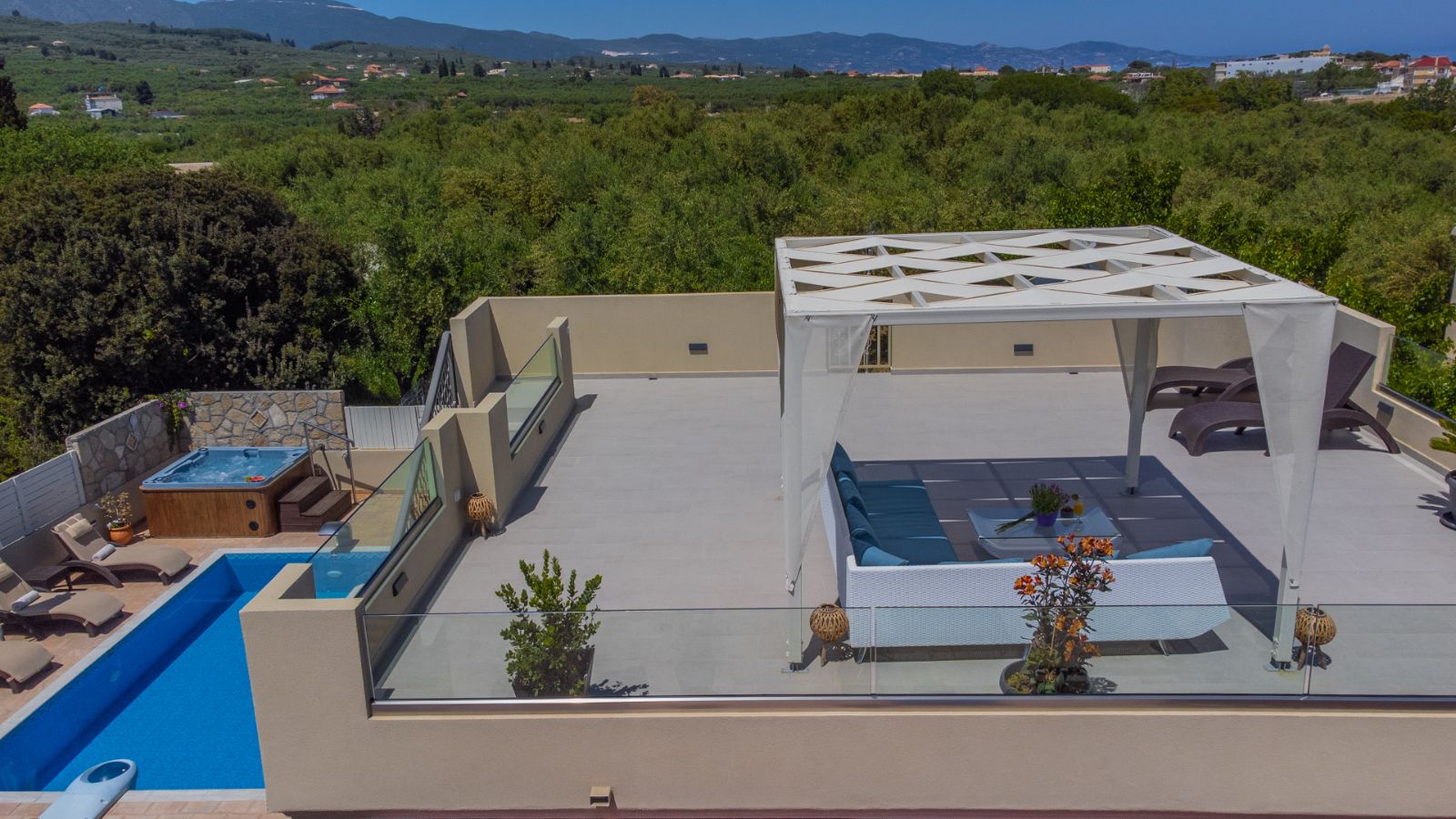 The main villa also offers an especially modified roof where sunbeds are situated as well as a table with chairs under a shaded tent and it is the best place for an evening drink or dinner.