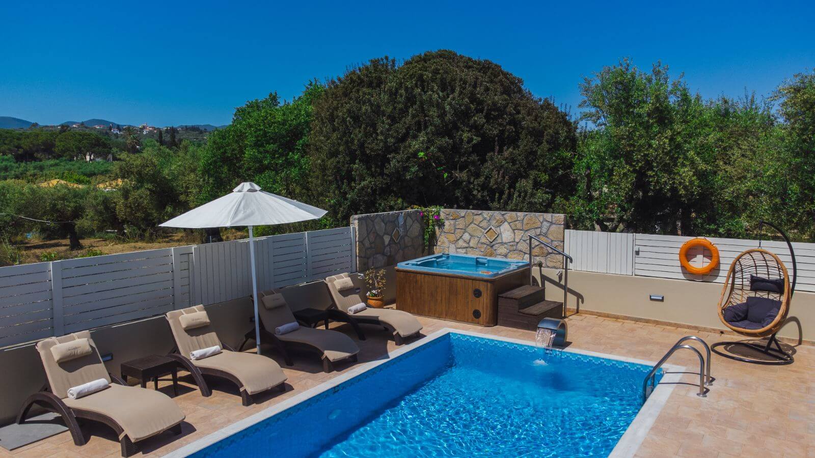 As you enter the main villa you can find the large living room and fully equipped kitchen along with the dining area and an office corner. One of the two bedrooms is also found in this area and offers two single beds that can be joined as one and one single sofa bed. Towards the back of the villa the master bedroom with the double bed as well as a bathroom with bathtub are located. The main entrance leads to a shaded veranda with dining table and a few steps take us at the private swimming pool.